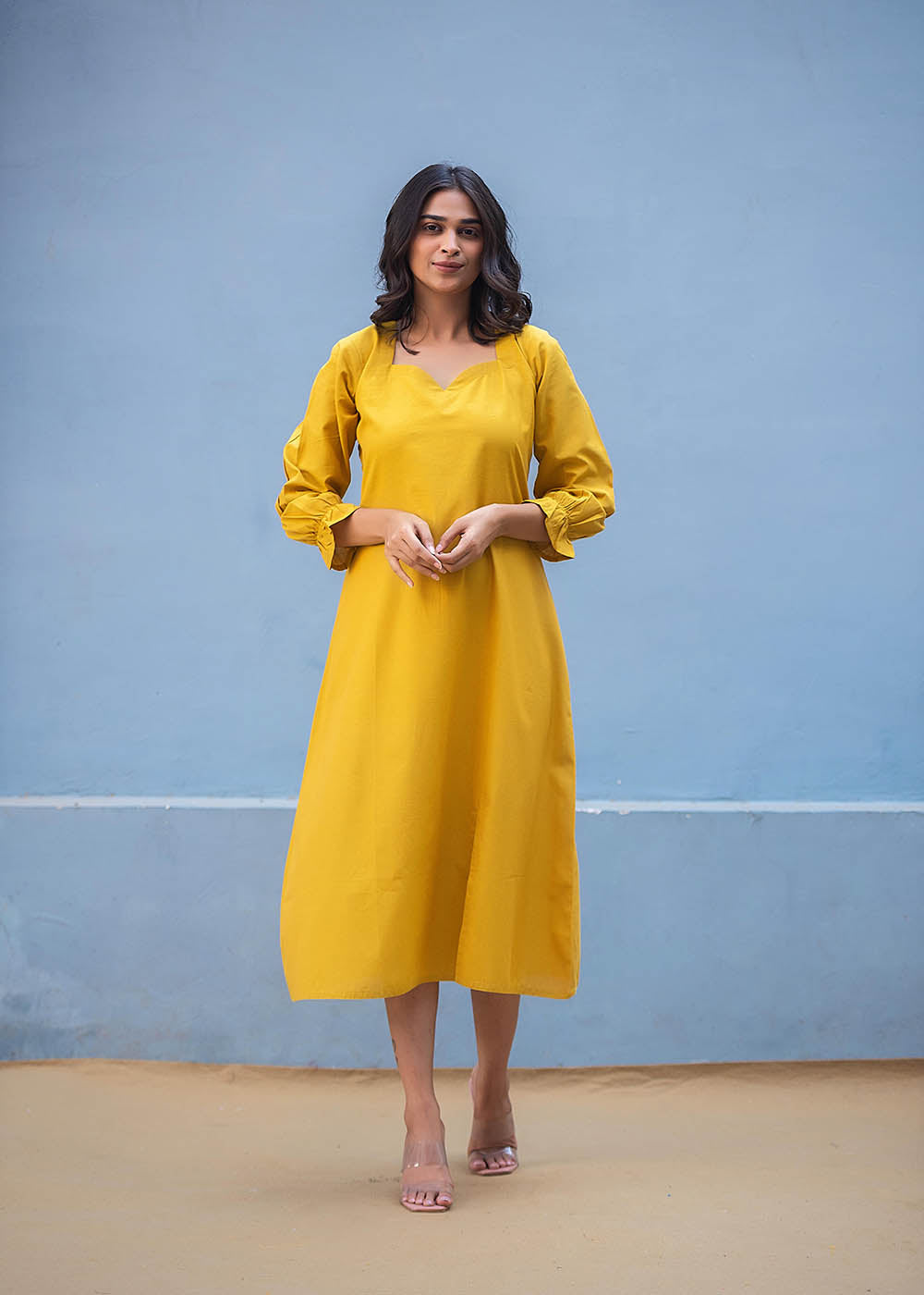 Brighten up your wardrobe with the Solid Yellow Front Slit Dress, a perfect blend of comfort and style for casual occasions. Crafted from breathable cheese cotton, this dress features a sweetheart neckline for a feminine touch and dramatic ¾ sleeves for a bold, fashionable statement. The front slit adds a modern edge, making it a standout choice for any day out.